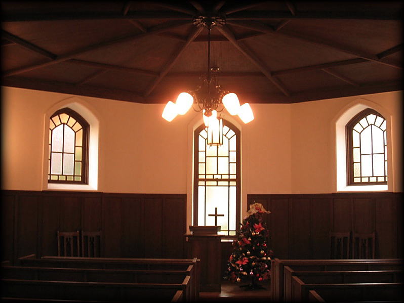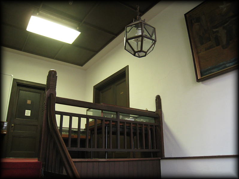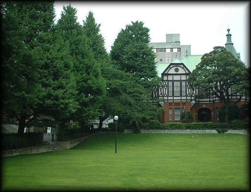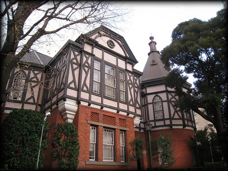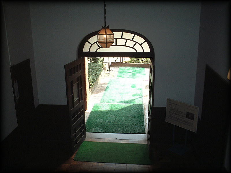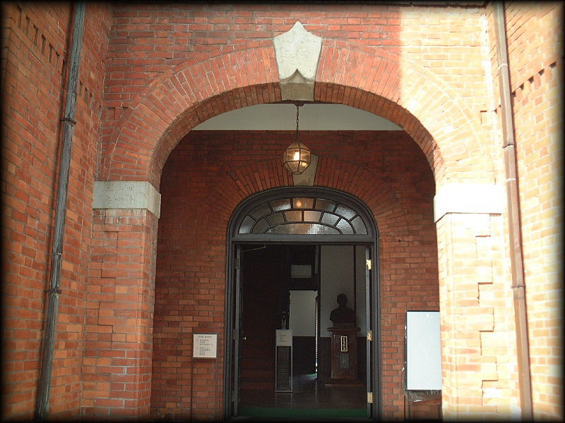 芝生の向こうに建つ記念館。銅板葺の屋根に木造の2階、1階の煉瓦という個性的な建築です。