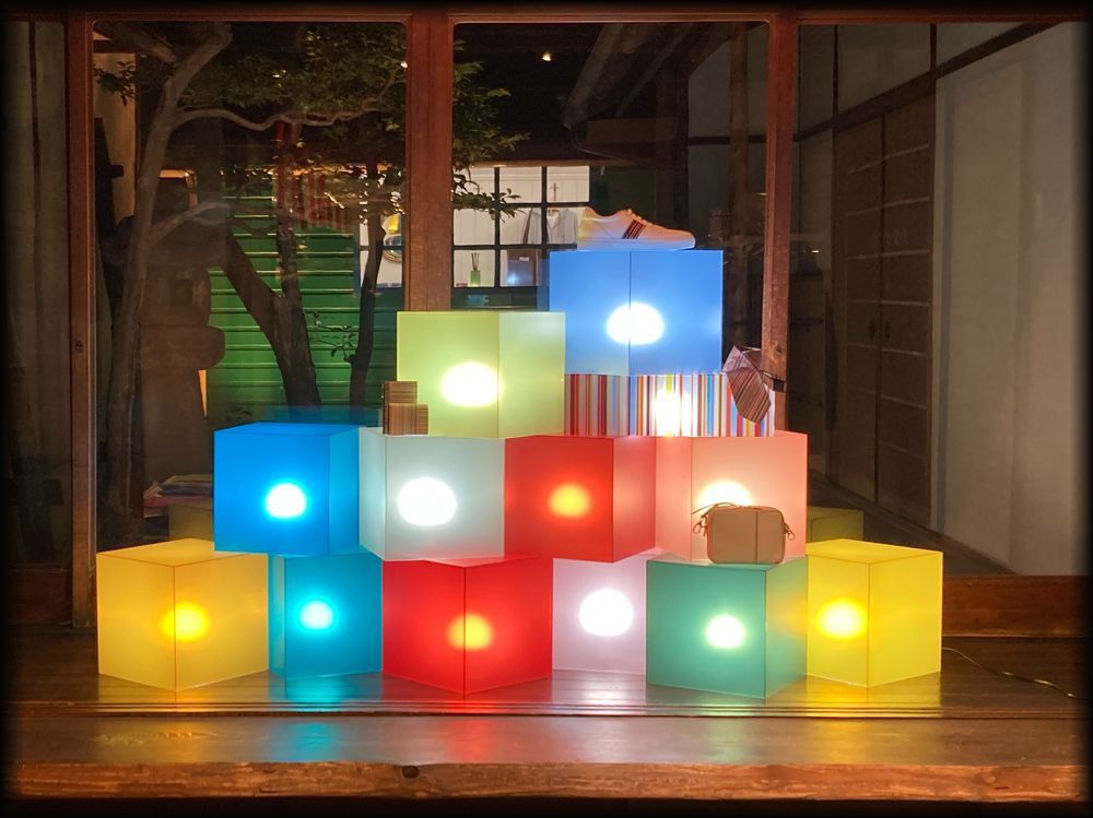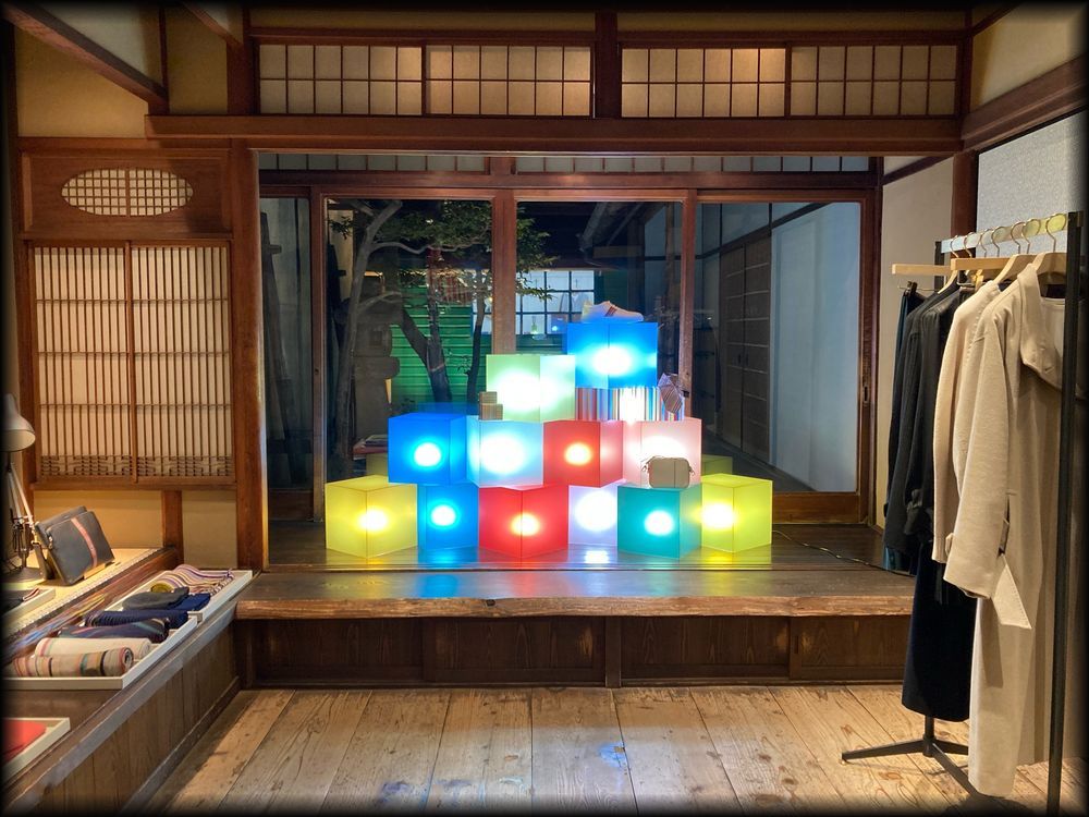 店内では、期間ごとにさまざまな展示が。この日は灯りとキューブが町家と坪庭と絶妙にマッチして、幻想的な美しさに。