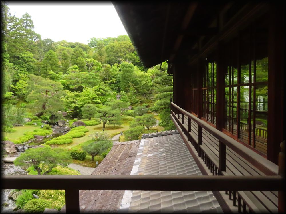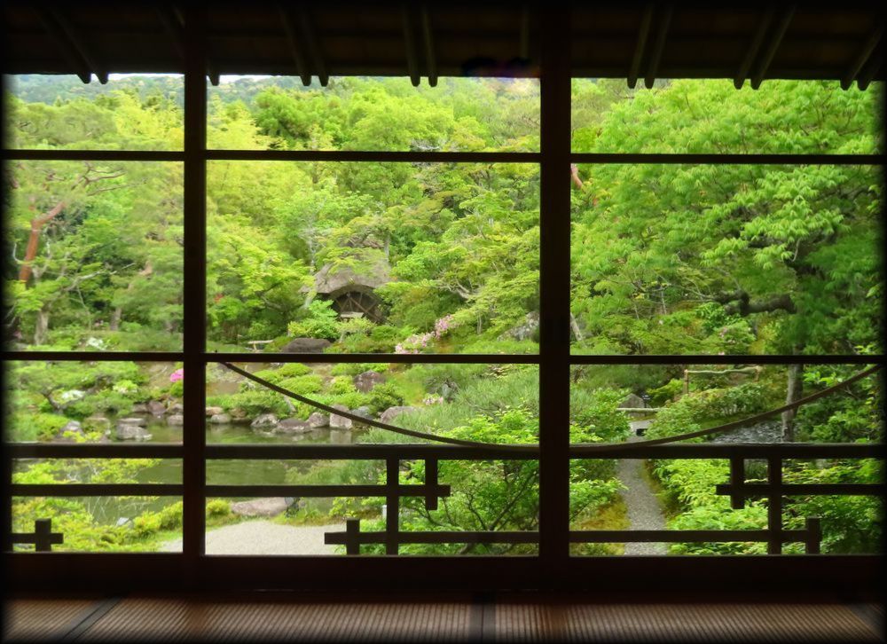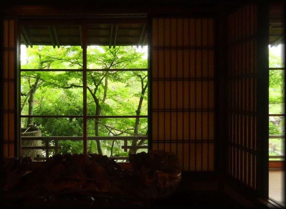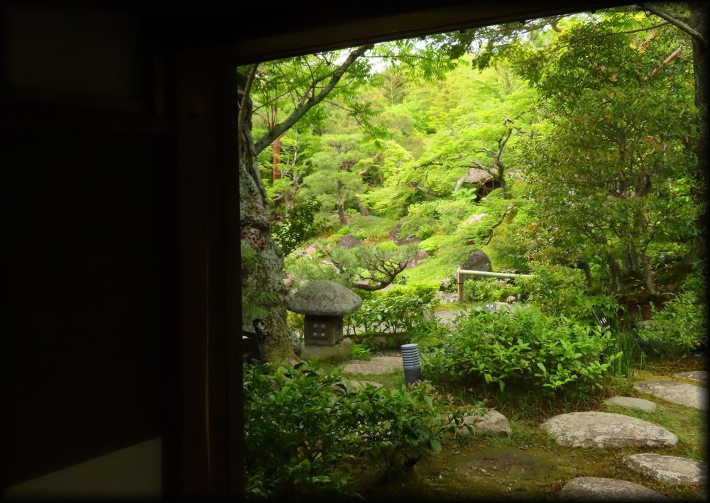 目の前に東山と新緑、庭の造形が目の前に迫ってくるような美しさ