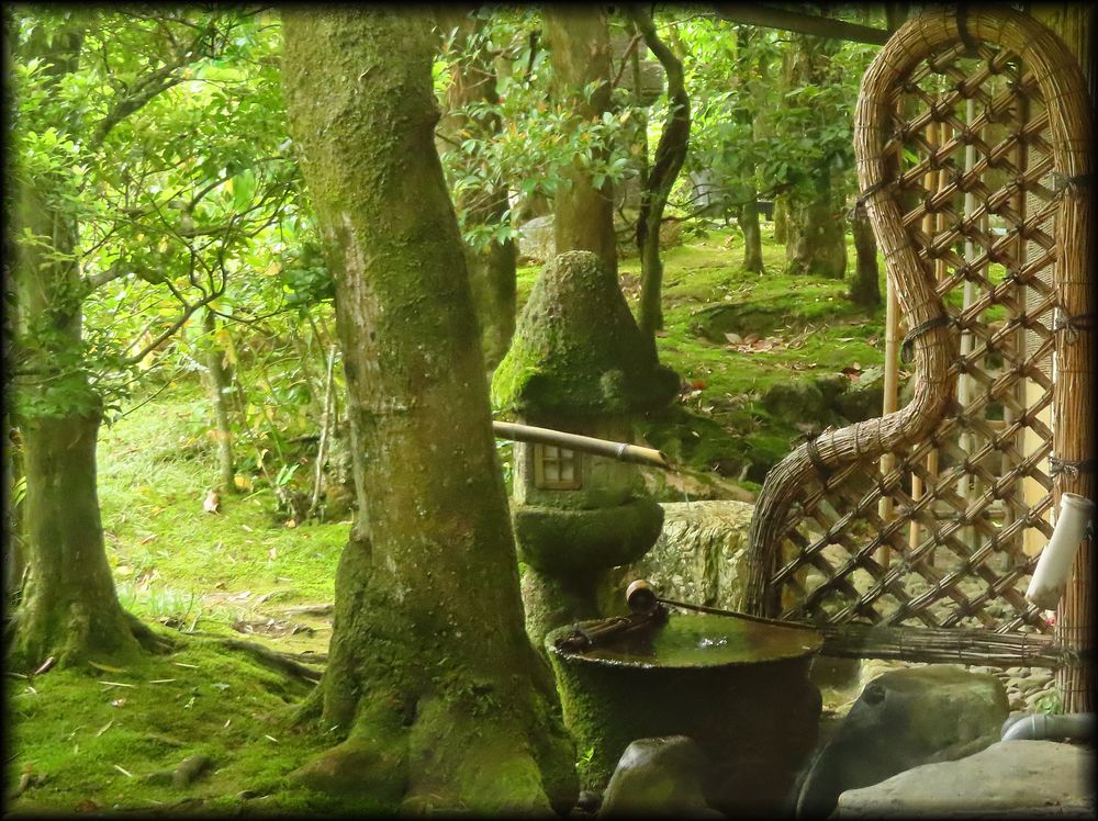 茶室は光と影がつくり出す幻想的な雰囲気。躙口(にじりぐち)からは大池の水車も見えます。