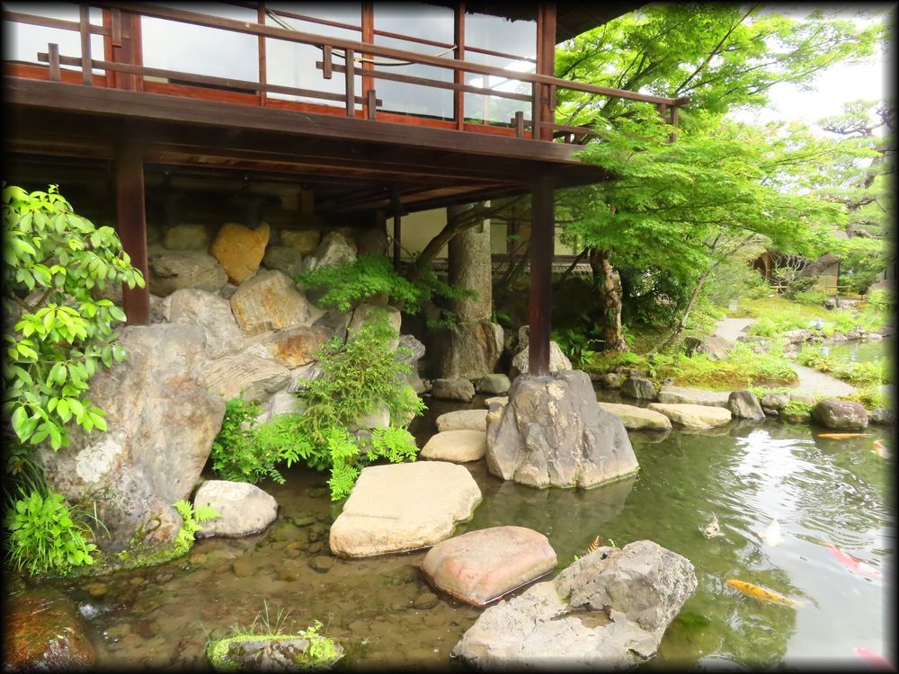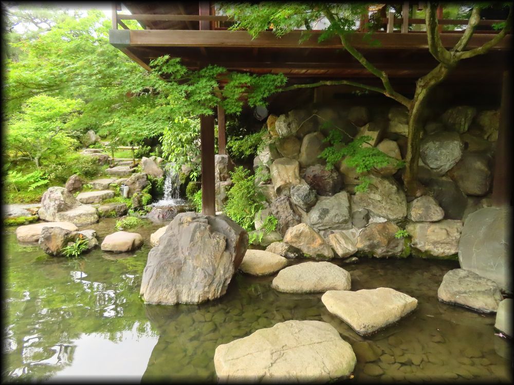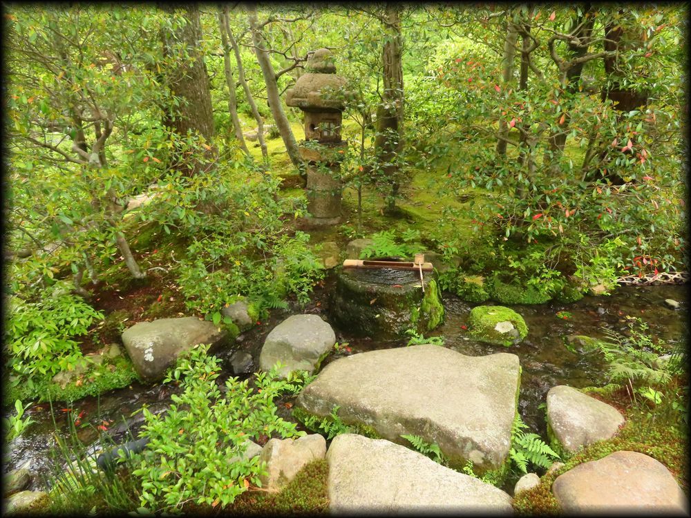 茶室「聚遠亭」と遣り水の中に置かれた流れ蹲踞(つくばい)